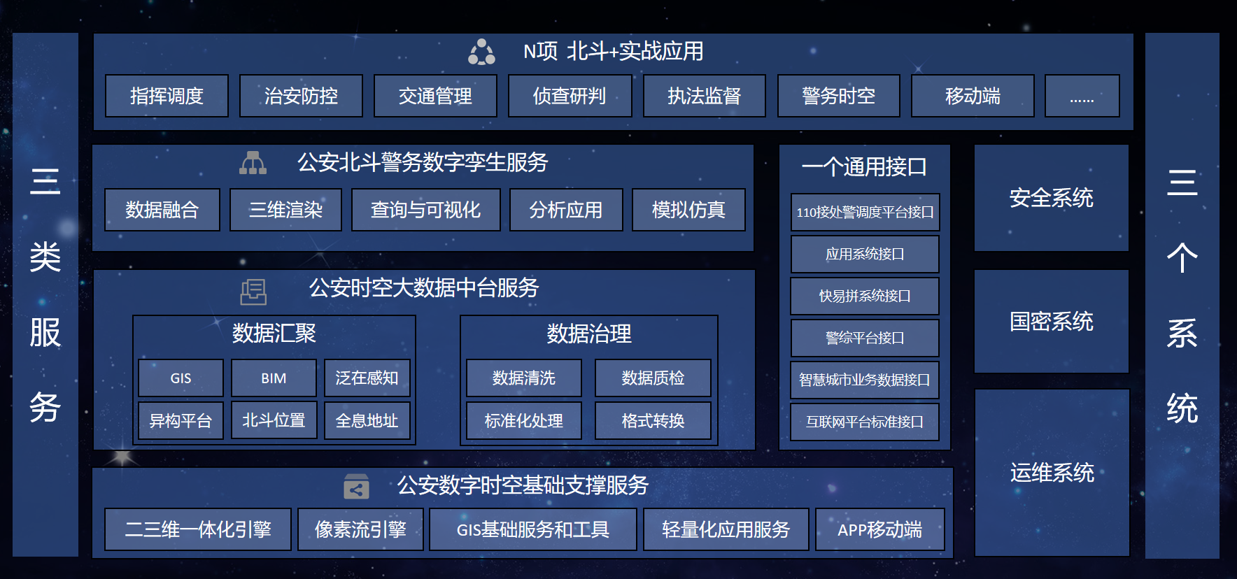 以北斗时空框架为基础,警务时空大数据为核心、多模态大模型驱动的城市全域全要素北斗警务数字时空基座。
