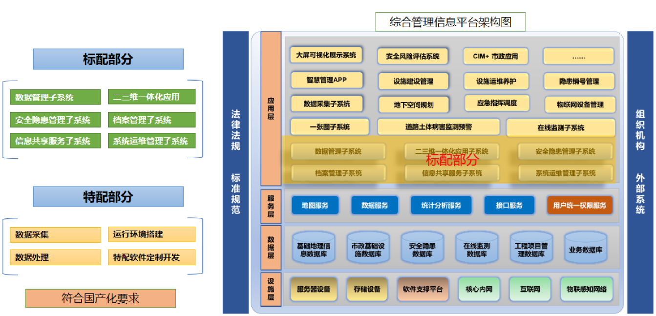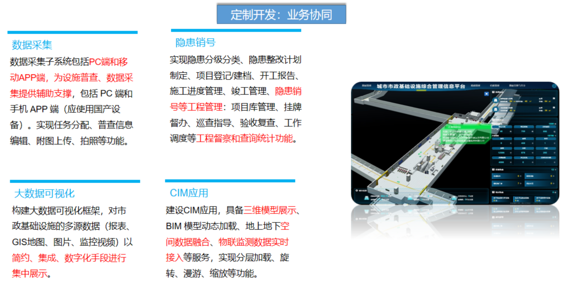 市政基础设施管理一张图:实现市政基础设施分布情况分析、设施资料调阅、专题数据查询统计等功能; 市政基础设施安全隐患一张图:对市政基础设施隐患风险点分布以及管控情况进行可视化分析; 市政基础设施监测一张图:对市政基础设施监测站点布局进行可视化分析;重点隐患部位应具有实时监测功能,其他重点部位宜具有实时监测功能;应具有实时监测数据查看、历史数据查询、监测数据统计分析等功能; 应具有超限预警、预警参数设置、预警日志查询、预警分析等功能。