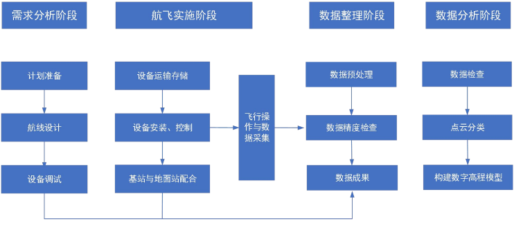 100C 激光雷达系统实施流程分为需求分析与计划准备、航飞实施、数据预处理、数据后处理四大步骤。