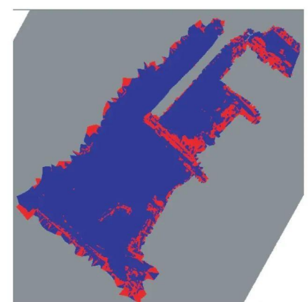 通过 3D Analyst 工具→栅格表面→填挖方工具来计算土方量。输出栅格为最终提取出的开挖或回填范围内的 DEM。以不同颜色标记填挖方区域。