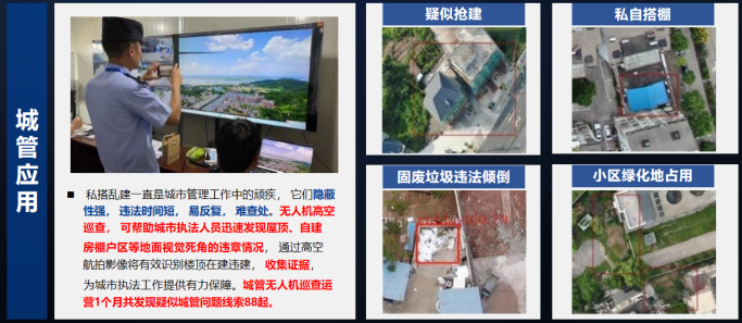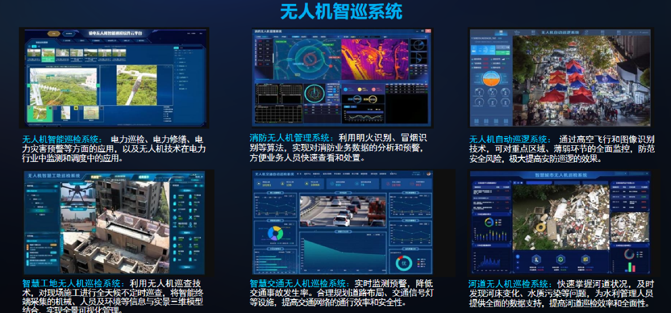 系统由无人机、机巢、云端管控平台构成的智能立体化巡查平台。用户可以使用该系统完成不用场景下的中低空的自动化巡检作业。通过无人机挂载物的多样性和数据回传的实时性,满足各类用户不同的应用需求, 广泛应用于城市治理、电力、交通、安防等场景。